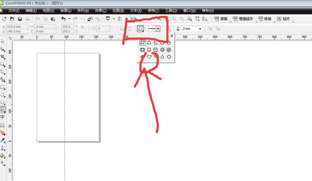 2、属性栏中会出现一个选项的下拉三角,点击一下找到下面的心形。在空白区域绘制心形,填充颜色