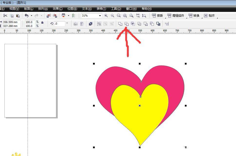 6、选择两个心形,在属性栏中选择修剪,将多余的部分删掉,就变为了一个空心的心形