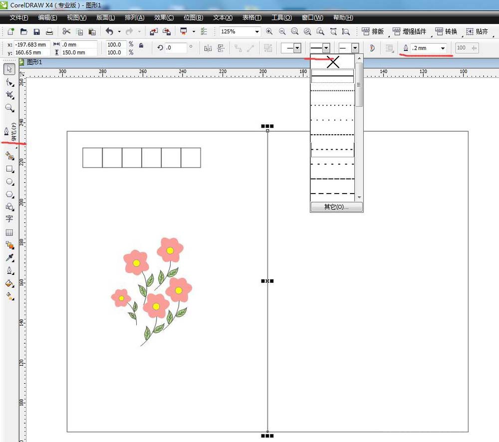 3、选择要填色的部分,左键填充颜色,右键点击空白方块取消轮廓。选中根茎右键颜色,填充颜色。依次填充好所有的色块完成一朵。复制几朵摆好位置。用钢笔工具画直线,两点连接得到直线,调整直线为虚线,调整线条粗细。同样方法画出信笺位置。