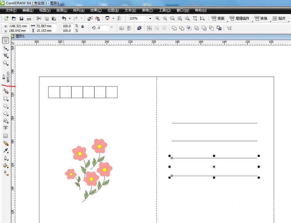 4、选中外框,点击交互式填充工具,选择颜色,填充效果,拉动鼠标左键可随意调整填色位置。再复制两朵小花点缀,完成明信片设计。