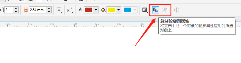 3、选中圆形后,点击工具栏【轮廓图】工具,在属性栏上找到【复制轮廓图属性】。复制轮廓图属性是将文档中另一个图的轮廓属性应用到所选对象上面。