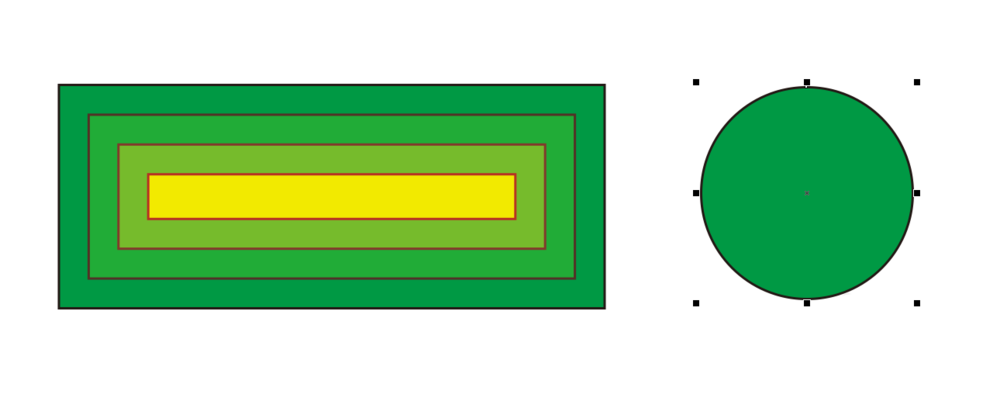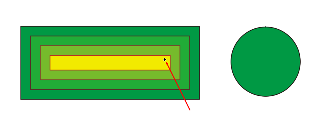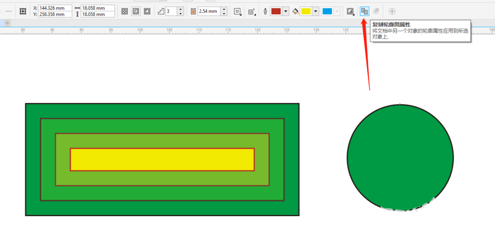 4、点击【复制轮廓图属性】后,鼠标会变成一个实心小剪头,用这个小剪头点击之前已经做好轮廓图的对象,会发现之前选中的圆形也有了和矩形对象一样的轮廓图效果了。如下图所示。