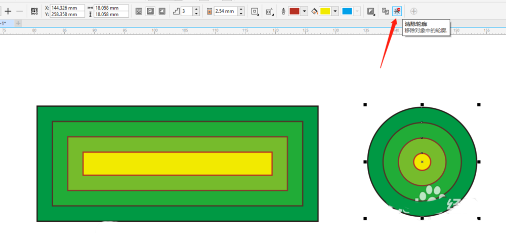 5、如果不喜欢这个轮廓图效果,可以直接选中对象后点击属性栏上的【清除轮廓】来清除所选对象的轮廓图属性效果。如下图所示图标。
