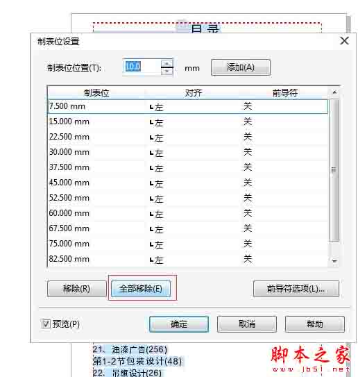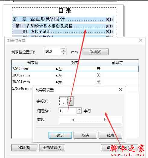 重复操作 调整前导符的间距,执行“文本”→“制表位”命令,在弹出的制表位设置中单击“前导符选项”,在“前导符设置”中设置“字符间距”,它会有实时预览的功能,非常棒的设计。