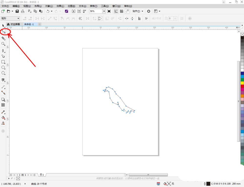 2、点击【钢笔工具】按图示绘制一个多边图案后,点击【形状工具】,框选图案上的节点,点击【转化为曲线】将节点转曲。完成后,选中图示图案上的节点,点击【平滑节点】将节点进行平滑处理并调整好控制点,完成主体部分图案的制作(如图所示);