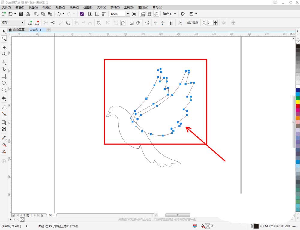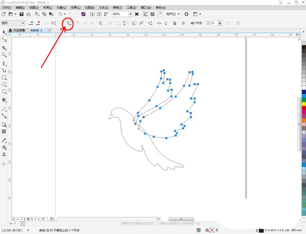 4、点击【形状工具】,框选图案上的节点,点击【转化为曲线】将节点转曲。完成后,选中图示图案上的节点,点击【平滑节点】将节点进行平滑处理并调整好控制点,完成翅膀图案的制作(如图所示);