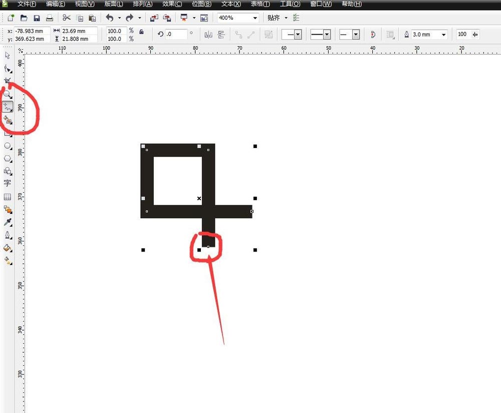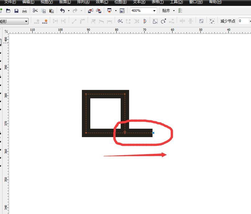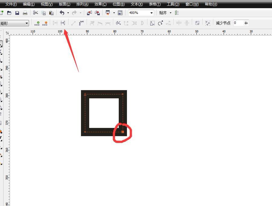 3、断开节点选项。用形状工具,选择正方形右下角的一个节点,然后在属性栏中找到断开节点这个功能,点击一下