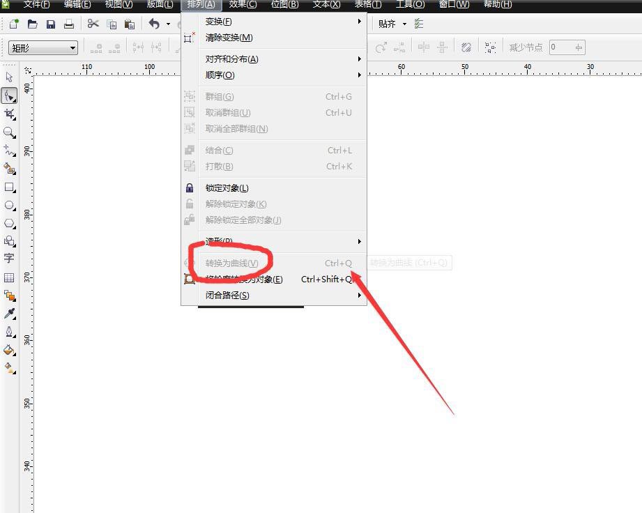2、转化为曲线。将这个矩形选中,然后在排列菜单栏中选择转化为曲线,这样就可以对节点进行调整了