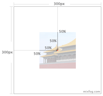 使用百分比进行定位的好处是可以利用CSS的计算功能,达到px定位所难以完成的任务。例如在一个宽高均为300px的容器中,使用
