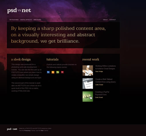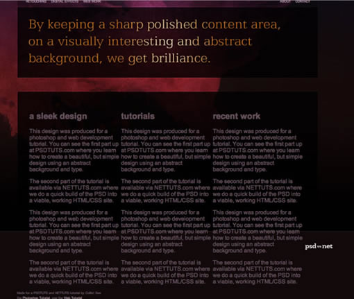 <p>This design was produced for a photoshop and web development tutorial. You can see the first part up at PSDTUTS.com where you learn how to create a beautiful, but simple design using an abstract background and type.</p>