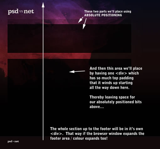 首先要做的是确定页面结构。随着你对CSS布局的逐步学习,这个过程会变得越来越简单。通过运用大量绝对定位和大幅背景图片,我们可以非常简单地完成这个设计。