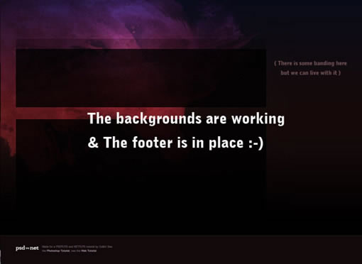 然后,我用那张窄条背景图片填充outside_container标签,图片只沿x轴(即从左向右)重复,没有背景图的地方我们会直接看到黑色 (#000000)。由于我们只横向平铺,页面拉长时我们不会看到向下延续的图片,而是看到黑色的背景。渐变成黑色的平铺图片让这一切表现完美!