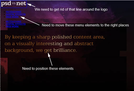 上图中,logo和头部元素看上去摆在了正确的位置,但菜单还有点儿怪怪的。设计样式前我们先说一下logo和大文本图片的事。你可能在想,既然它俩都是图片为什么不放在背景图片里就好了?