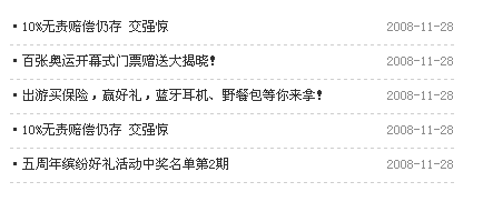 <li class="newslist"><span>2008-11-28</span>·<a href="#">出游买保险,赢好礼,蓝牙耳机、野餐包等你来拿!</a></li>