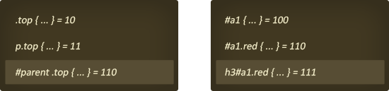 然而,特异性在CSS中是一个很大的领域,它不能用一些简单的语句解释清楚。这里是一些示例: