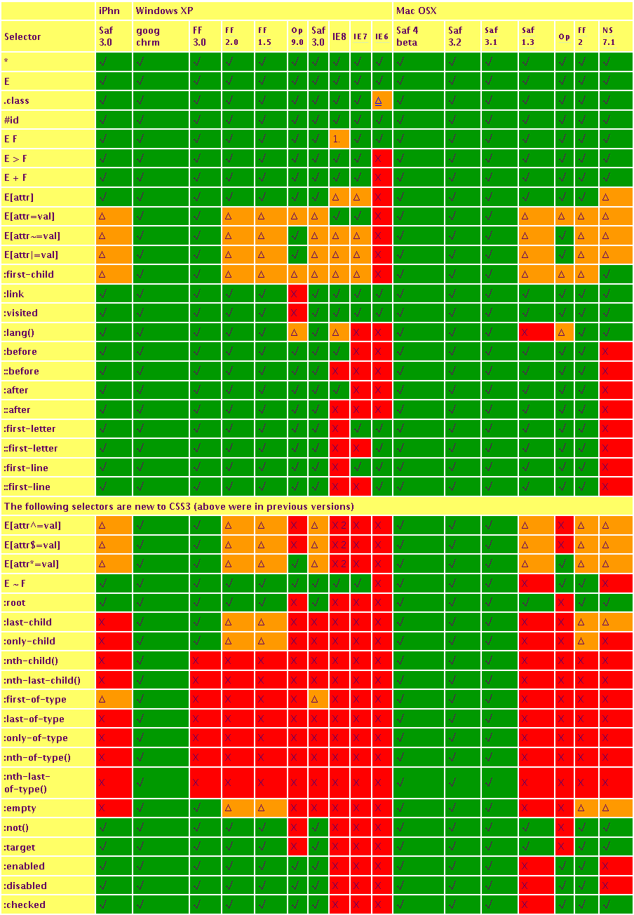 2009年2月24日,Safari 4.0 beta版正式发布,Safari从它的3.2版本开始就已经支持所有的CSS选择器(包括最新的CSS3)。不过为了方便大家的工作,下面提供了最新版本的CSS选择器浏览器支持情况,其中包括最新的CSS3和Safari 4.0 Beta的支持情况。感谢Estelle Weyl的总结。