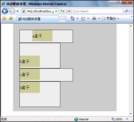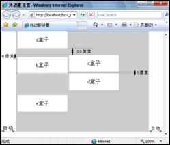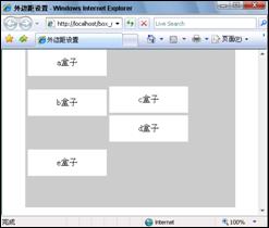— 说明:读者可以尝试把b盒子的顶部边距设置为5像素,这时b盒子和c盒子高度一致。d盒子无法“流”上来,d盒子将自动换行,位于b盒子下面。