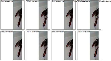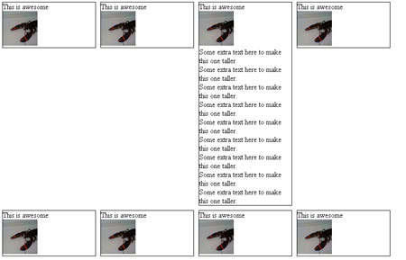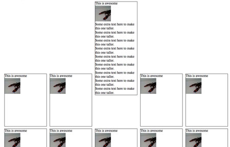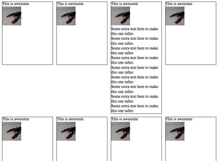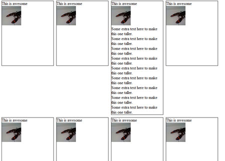 一般说来,这种类型的布局是小菜一桩。固定宽度,固定高度,向左浮动就解决了。但是,这个设计中内容的多少是可变的,这就意味着如果这些块中的一些内容比其他的多,就会破坏这个布局。