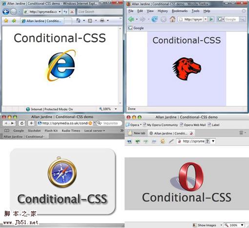 注意这个例子不适合部署在实际生产环境中,因为你只想在各浏览器总保持一致的布局,而条件 CSS 只是用来修正 CSS 显示 bug。但是这个例子确实给出了一个好的例子用来说明不同的 CSS 怎样定位不同的浏览器。