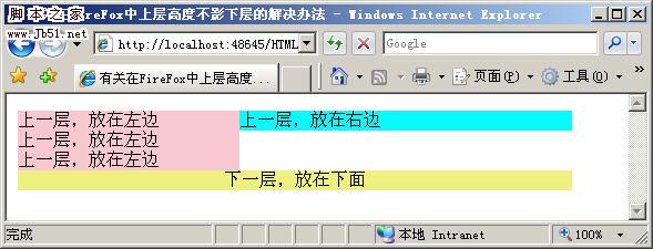 在这个网页中,创建了三个层,上面两个层是并列的,下面一个层是单独的,在IE中浏览可以达到我想要的结果,如下图所示: