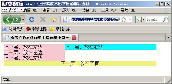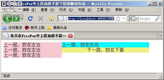 从上图中可以看出,左边的层并没有将下面的层“挤”下去,而是超过了下面的层。这么一来,版权信息就会横在文章内容之中了。如果仅仅只是Firefox是这样的话,也就算了,可是连Opera、Flock都是这种显示结果,让我不得不改了,研究了很久,终于让我找到了一个解决方法,就是在下面的层上加上 “clear:both”,如下所示: