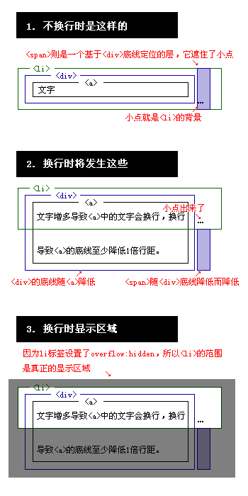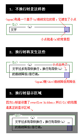<!DOCTYPE html PUBLIC "-//W3C//DTD XHTML 1.0 Transitional//EN" "http://www.w3.org/TR/xhtml1/DTD/xhtml1-transitional.dtd"> <html xmlns="http://www.w3.org/1999/xhtml"> <head> <title>无hack无js全兼容text-overflow-ellipsis效果</title> <meta http-equiv="Content-Type" content="text/html; charset=gb2312" /> <style type="text/css"> * { margin:0; padding:0;} .list ul { font-size:12px; font-family:simsun; text-align:left; line-height:18px; width:11em; background:#fff; } .list li{ height:18px; overflow:hidden; position:relative; padding-left:1em; background:url(http://img.jb51.net/images/ico.gif) no-repeat 3px 6px; } .list a{ display:block; padding-right:1em; background:url(http://img.jb51.net/images/pot.gif) right top no-repeat; position:relative; zoom:1; word-break:break-all; } .list a span { position:absolute; right:0em; bottom:0; height:18px; width:1em; background:#fff; overflow:hidden; } </style> </head> <body> <div class="list"> <ul> <li><a href="#nogo">该标签中字符超过十个了<span></span></a></li> <li><a href="#nogo">只有六个汉字<span></span></a></li> <li><a href="#nogo">该标签中字符超过三十个了该标签中字符超过三十个了该标签中字符超过三十个了该标签中字符超过三十个了<span></span></a></li> <li><a href="#nogo">blueidea blueidea blueidea<span></span></a></li> </ul> </div> </body> </html>