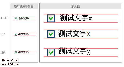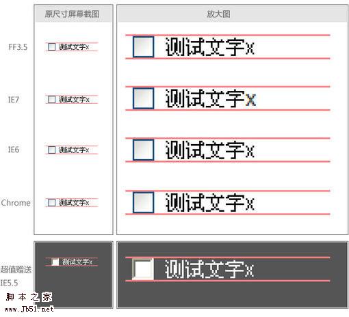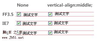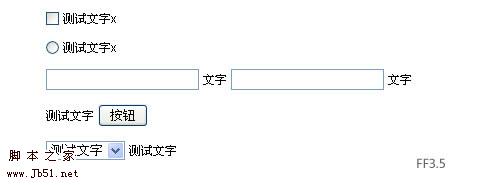 但是这对于中文来说,并不是一个好的结果。因为中文是方块字,并且相同字号的情况下,高度会比小写的x高出很多。所以,按照浏览器内置的方式,只用 vertical-align:middle是无论如何也无法对齐中文的(无论是只写中文,中文在前,英文在前,FF3.5都是按照小写x中心那种方法来对齐的)。但是回头再看看wheatlee的文章,他说这个小写x中心对齐的渲染方式,是对于“文字”来说的。那么,如果不是文字呢…?如果复选框后面跟的是一个行内元素,如label,而文字是写在它内部的,会是什么样呢?浏览器会不会将这个内联元素整体看作一个“块”,然后依照类似图片的规则进行渲染呢?如果那样,我们就达到目的了。