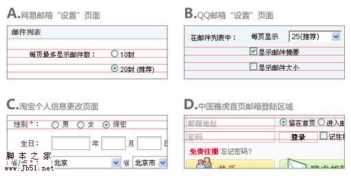 于是,尝试去掉radio的外边距,刷新后显示正常。(其实多选框checkbox也是有外边距的,只是它的外边距四个方向都有,并且相等,所以对于垂直对齐没有影响。)下图是一些常用表单元素的最终显示效果以及最终代码,大家可以用不同浏览器看一下实际的效果(注:由于演示使用的12px的中文实际只有11px高,而 IE下文本框等元素的高度是22px,一个是奇数,一个是偶数,所以这些部分在IE中是无论如何也对不齐的,差1px。如果手动控制文本框高度为奇数,或者将文字设置成为偶数的高度,则显示正常):