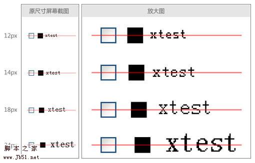 如果按照之前的设想,红蓝两线应该是重合的。但现在的情况是,它们相差了1px。并且这1px是没有规律的,随着字号的放大,并不恒定,貌似轻易也无法提炼出对应关系来。于是想到,再试一下将label也加上vertical-align:middle。结果如图: