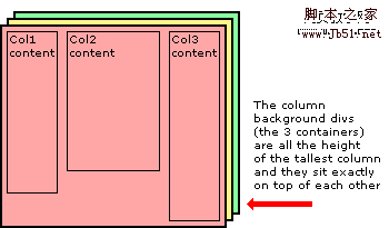 上例中有包含不同内容的 3 列,可以看出存在的问题是列的背景色随着其包含内容的高度而自适应展开。这是我们要解决的问题。如何使所有的列等高?或具体的说,如何使所有列的高度等于最高列的高度?这很棘手,因为我们不清楚每列将会多高,哪一列是最高的。不能简单的给所有列一个固定的高度,如果内容很少将会导致页面底部有大片空白;如果内容太多则会在文字显示完全前关闭。两种情形都不妥。实际上,内容的长度是动态的,所以每列的高度也是动态的。必须意识到 Web 上没有固定的东东,乡民们有不同的屏幕分辨率,浏览器中的文字也可能被设置为任意大小,所有这些都会影响内容的高度。