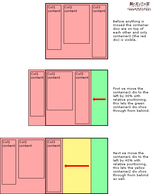 现在用相对定位把容器移至新的位置。移动后 div 如下图所示。即等高列背景容器的层叠和位置。为了显示右侧的绿色列 container2 向左移了30%,为了显示中间的黄色列 container1 向左移动了40%,与此同时红色部分依然可见作为左侧列。