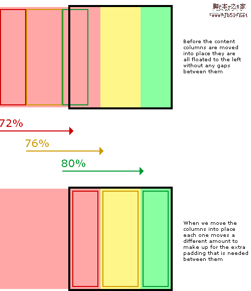 不过不用担心...我们可以用完全不依赖于 padding 的方法来解决这个问题。相反,我们把列弄窄一点(列宽减去两侧的 padding),之后用相对定位把它们移至正确的位置。在我们的例子中我们用了 2% 的 padding,则 30% 的列将减至 26%,40% 的列减至 36%。用相对定位移回列时需谨记,现在列变窄了,所以当它们一起像最初那样左浮动时,每一个需要比上一个移动更远的距离。