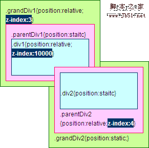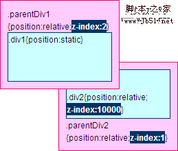 父元素居下,子元素也可以居上的情况,则是利用非同辈元素在祖元素具备动态布局时,其比较已经与position:static无关,而其祖元素却可以通过html的位置来进行比较。