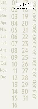 其实现过程已有Chris Coyier 在《Date Display Technique with Sprites》一文中作了详细介绍,这里把其实现过程作一个简单的描述。很显然,我们不希望每一个日期用一张单独的图片,因此,将其整合到一张图片之上,安排年、月、日在图片的不同区域,如图: