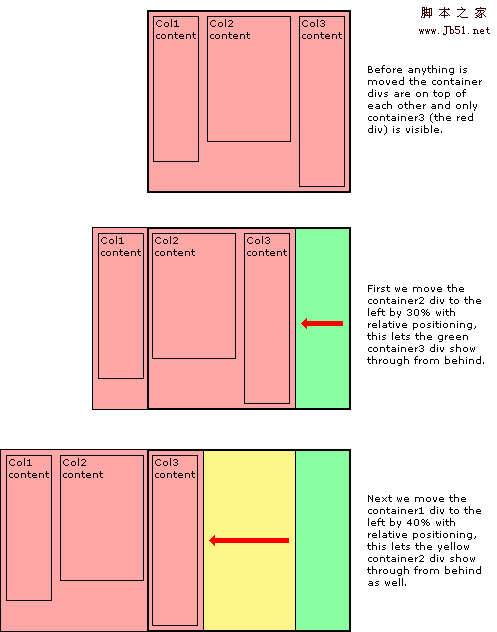 现在是所有容器都完美地累在一起,只显示一种背景颜色,我们必须让其他背景也显示出来。为此我们就得利用相对定位来让这些容器像阶梯一样放置。这个本可以使用负边界技术,但该死的IE5.5的盒子模型与W3C的不一致,为了兼容我们就得使用到CSS hack。由于本文声明是不使用CSS hack,因此放弃。首先让#container2向右移到30%,由于#container2装着#container1,而#container1上装着那三个列,这样一来,最右边的列就被移出游览器的右边了。而最外围最底层的容器#container3则露出来了,露了左边的30%。然后我们再移动最上层的容器#container1,向右边移动40%,于是原来盖住的第二层容器也露出来了,露出其左边的40%,而#container1则只剩下100%-30%-40%=30%;上方的列也只剩下最右边的列,却表现为位于最左边。这样,背景也显示正常了!
