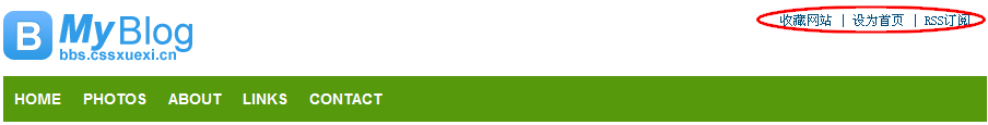 什么?CSS代码多了?的确,由原来的两句话,变成现在的四句,但是有没有发现,就靠Position我们就可以将Logo随意的定位于任何一个地方!这就是它的灵活的地方!如果在页面顶部在有一行“加入收藏 | 设为首页 | RSS订阅”如下图,你是不是也可以很方便的将它们定位于右上角呢~