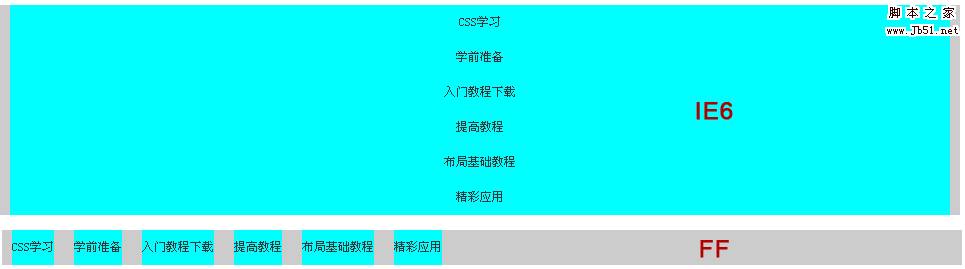 IE6和FF显示效果居然大相径庭,IE6中为什么所有链接纵向排列了呢?其实这个也很简单,IE认为a既然转化成块状元素,就拥有块状元素的特性---霸道,它是不允许其他元素和它同一行,再加上也没有对a的宽度进行设定,所以才导致IE6中这么显示,不过FF中为什么不这样呢,和我们想象的一样,那是因为FireFox认为a即使为块状元素,也应该受到外面<li>元素的影响,所以如此现实,究竟以谁标准,因为大家都认为FF是标准浏览器,所以大家可以以FF为标准,不过KwooJan认为,不用管谁标准不标准,那都是相对的,我认为IE标准,FF就不标准了呢,我不愿意在这个问题上浪费精力,我更喜欢将精力用在思考如何提高页面的浏览器兼容性!
