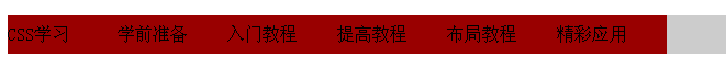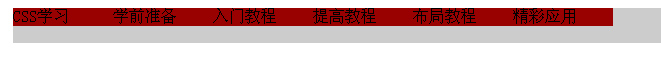 盒子做好了,我们就要往里面放导航条中的内容了“CSS学习 学前准备 入门教程 提高教程 布局教程 精彩应用”,如果我们把这内容(目前有6个),当成酒杯的话,如果直接放到盒子里面的话,肯定会乱,并且还会东倒西歪,一点顺序都没有,但是我们平时会用一个隔板将每个酒杯隔开,这样就是酒杯很有序的放入盒子,并且牢稳而且防震,方便使用!现在我们把这个隔板叫做“有序列表”起个英文名字叫:ul,里面的每个单元格我们也给起个英文名字叫“li”,大家想想里面的这个ul是不是和盒子里面的空间一样大,小了,酒杯放不进去,大了杯子就会不稳,所以我们定义UL的时候大小一定也要和外面的盒子一样大哟~,所以呢,我们的代码就知道怎么写了吧