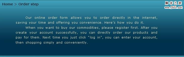<p class="elegant">When you want to buy our commodities, please register first. After you create your account successfully, you can directly order our products and pay for them. Next time you just click “log in”, you can enter your account, then shopping simply and conveniently.</p>