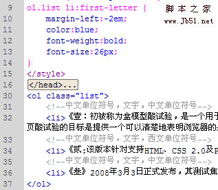 这下,前导符就和文字保持一定距离了,而且能控制的样式也更多一点。不过前导符后面那个顿号就控制不到样式了,但我想可不可以设置背景图来取代呢?简单测试却发现,控制first-letter伪类的背景,与控制list-style-image一样让人琢磨不透,遂弃之。