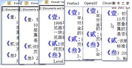 另外,各个浏览器对待前导符旁边的符号处理方式也不一样,因为没有安装Safari,所以没有测试它:代码: