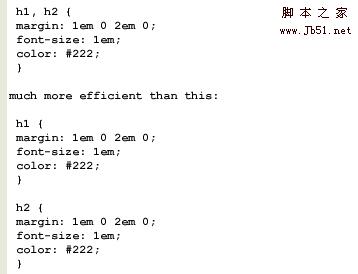 尽可能的利用分组声明属性,而不是每次重新声明,如有H1\H2两个元素都使用相同的font size color margins那就用逗号,把它们分在一个组内: