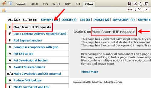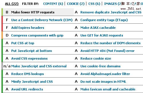 YSlow 显示了 HTTP 请求数之外可以提升网站性能的因素