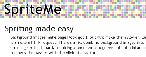 有些工具,例如来自 Fondue 项目的这个,提供输出 CSS 选项。Steve Souders’ 的工具 SpriteMe 是另一个提供 CSS 编码选项的。SpriteMe 会把现有的网站背景图片转换成单张 sprite 图片(我之前提到的“大型” sprite)并提供下载以供编码入页面之中。然而这些工具只是有助于创建 sprite,并不能在维护方面提供多少帮助。Souder 的工具貌似对重新设计或布局的网站无效,而且只对那些现有的没有使用 sprite 方法的网站有用。