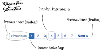 你可以使用包含<li>标签(每个<li>均单独对应一个分页元素)的HTML列表 (<ul>) 来设计这样的结构,并分配一个ID给<ul>列表以便为当前列表应用具体的分页样式。看看下面这些教程以作说明。
