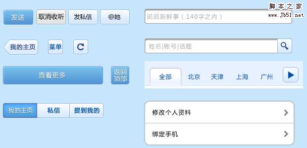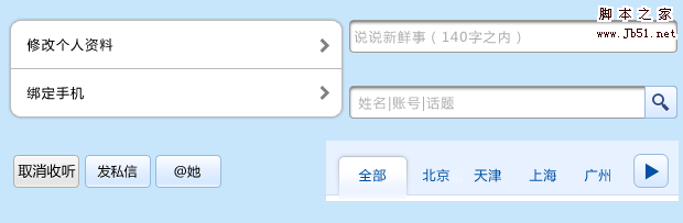 在没有css3 以前,或者说,在webkit没有占绝对的优势以前,圆角对于制作经理来说,都是一个纠结的死角。九宫格、N层div嵌套、一个图片的十八般切法,甚至不 惜恐吓威胁设计师:你再做圆角,我就死给你看!好吧,到了高端手机时代,这一切恩怨都可以抛下了,一个html元素、几行css,全部搞定。现在我们可以 拥抱设计师,大声宣布:让我们尽情圆角吧!事情要从我们无线的第一个高端手机web应用——手机微博高端版说起,作为一个完全针对高端手机的web项目, 经过我们初步测试,css3的绝大多数属性都能在iPhone、Android这些高端手机自带浏览器上完美表现,那么,此时不用更待何时?!于是,我们 的设计gg就有了一次痛快淋漓的圆角体验,请看这些圆角们: