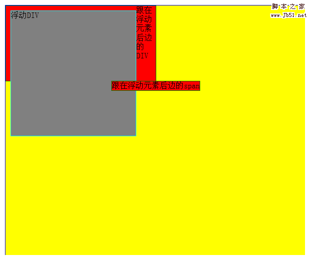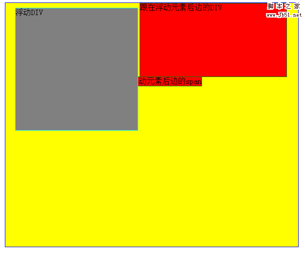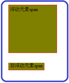 从图中可以看出来,跟在浮动div后边的div背景以及边框被压在了底下,内容却没有,span整体都在浮动div之上显示。