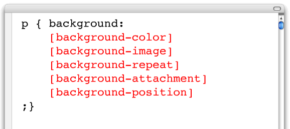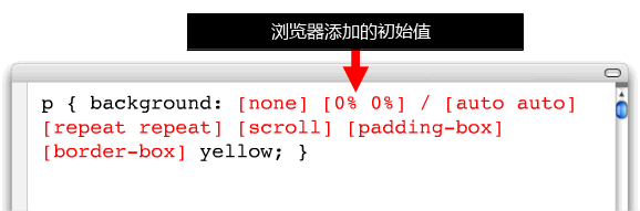 如果你想使用缩写属性,你需要理解知道初始值。因为这些值有些可以应用,而有些可以当做打酱油的。当我们使用一个缩写的时候,没有必要定义所有的background属性,例如: