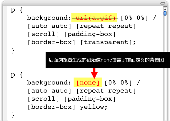 background-colortransparentbackground-imagenonebackground-repeatrepeatbackground-attachmentscrollbackground-position0% 0%background-originpadding-boxbackground-clipborder-boxbackground-sizeauto当我们对同一个元素应用两个background规则的时候会发现有一个是不起作用的。