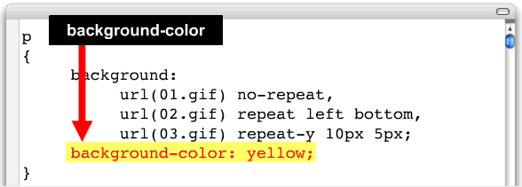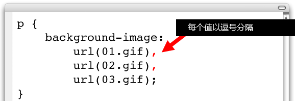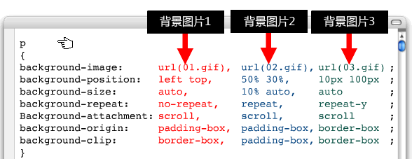 p {background: url (01.gif) no-repeat, /*图片1*/ url (02.gif) repeat left bottom, /*图片2*/ url (03.gif) repeat-y 10px 5px /*图片3*/}